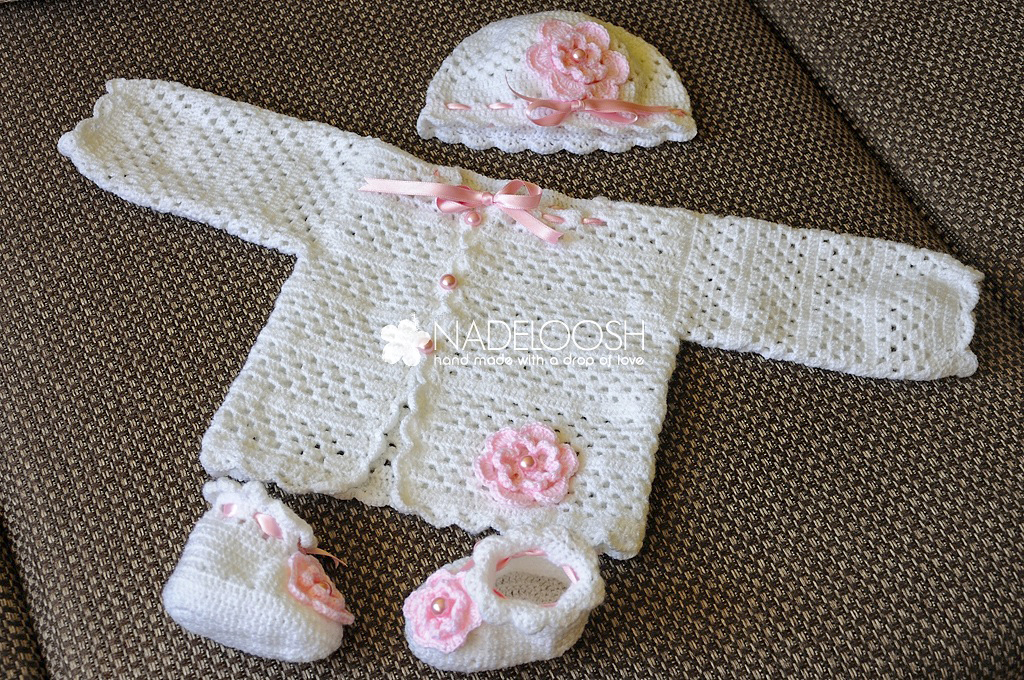 Inspirat din cele mai frumoase povesti, costumasul de botez Sissy reprezinta alegerea ideala pentru ca fetita ta sa devina o mica printesa in unul din cele mai importante momente din viata. Setul complet contine puloveras, botosei, caciulita si paturica, toate crosetate PNA de calitate, material delicat cu pielea, calduros si placut la atingere. La cerere putem crea si alte piese pentru a completa setul – manusi, pantalonasi. De asemenea setul poate fi realizat si pentru baietei, cu garnitura bleu.